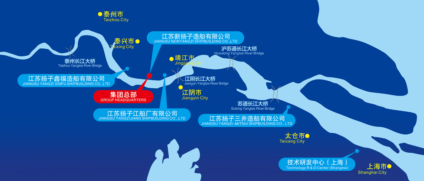 集團公司下轄江蘇新?lián)P子造船有限公司、江蘇揚子鑫福造船有限公司、江蘇揚子三井造船有限公司及江蘇揚子江船廠有限公司4家造船企業(yè),分布于長江下游江蘇省境內(nèi)的靖江市、泰興市和太倉市的黃金水道兩岸,距上海、南京兩大城市均170公里。