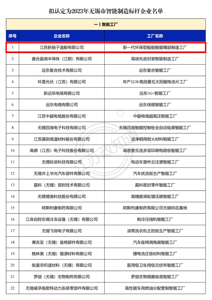 我集團(tuán)江蘇新?lián)P子造船有限公司被認(rèn)定為“2023年無(wú)錫市智能制造標(biāo)桿企業(yè)”。