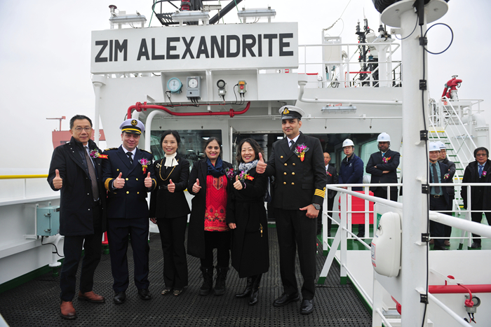 Tracy Hui女士將新船命名為“ZIM ALEXANDRITE”輪,為新船砍纜、擲香檳禮并與嘉賓們登船參觀(guān)。汽笛鳴響,祝福新船以及隨船船員航行平安,為船東和租家?guī)?lái)榮譽(yù)和財(cái)富。