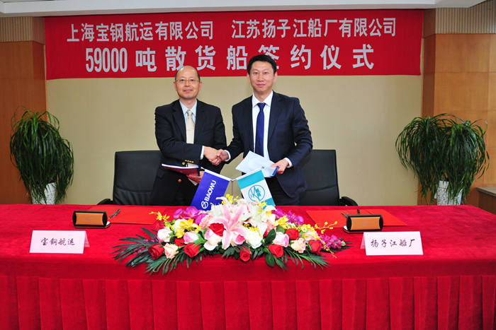 ▲11月13日下午,我集團(tuán)下屬江蘇揚(yáng)子江船廠有限公司與上海寶鋼航運(yùn)有限公司簽署了2艘59000噸散貨船新造船合同。集團(tuán)董事長(zhǎng)任樂(lè)天先生,寶鋼資源(國(guó)際)有限公司董事長(zhǎng)張典波先生,寶鋼資源(國(guó)際)有限公司總裁陸克從先生,我集團(tuán)副總經(jīng)理宋書(shū)明先生,副總經(jīng)理杜成忠先生,以及來(lái)自寶鋼資源、寶武原料、寶鋼航運(yùn)、中聯(lián)海運(yùn)、上海船舶研究設(shè)計(jì)院、中國(guó)船級(jí)社等領(lǐng)導(dǎo)和重要嘉賓出席簽約儀式。