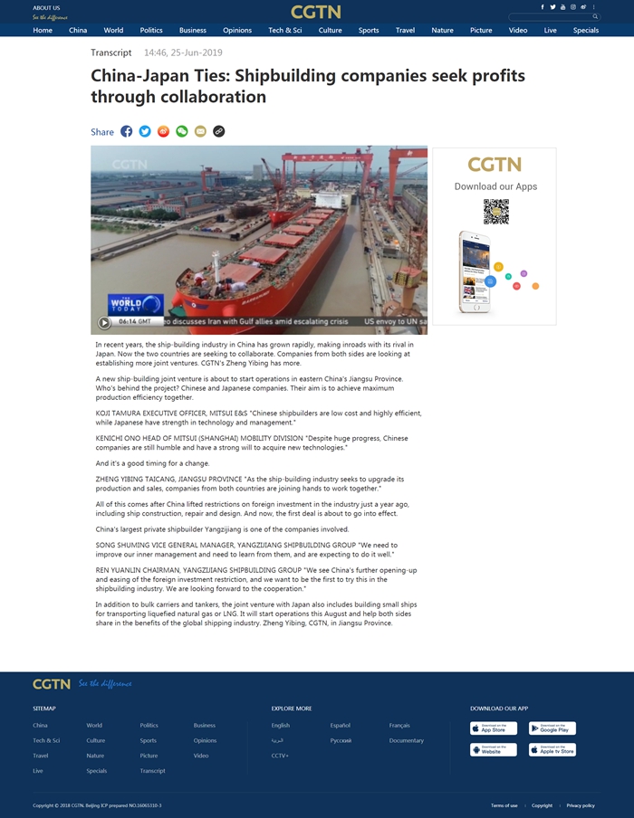近年來(lái),中國(guó)造船業(yè)迅猛發(fā)展,與日本船企形成了競(jìng)爭(zhēng)?,F(xiàn)兩國(guó)正致力于尋求在造船方面合作共贏,兩國(guó)企業(yè)均期望建立更多合資公司。CGTN的鄭亦冰帶來(lái)以下最新報(bào)道。
