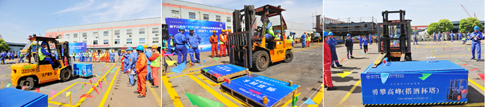 啟動(dòng)儀式后,來自新?lián)P子造船9個(gè)車間/部門舉薦的18名叉車工參加了首場技能競賽。叉車工競賽項(xiàng)目為勇闖四關(guān)。四關(guān)是指實(shí)干篤行(過S彎道)、強(qiáng)基固本(巧碼貨盤)、專業(yè)精進(jìn)(寬物進(jìn)窄門)、勇攀高峰(搭酒杯塔),項(xiàng)目是對(duì)參賽選手綜合能力的考驗(yàn),要求做到“快、巧、準(zhǔn)、穩(wěn)”,即快速通過障礙、叉運(yùn)寬物進(jìn)窄門、精準(zhǔn)堆放貨盤、平穩(wěn)搭建杯塔。