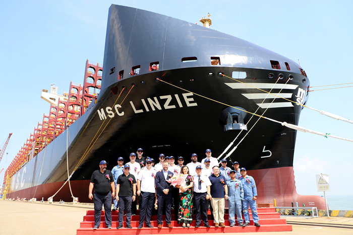 9月4日,我集團與地中海航運共同為新船舉行了命名祈福儀式。命名人Martyna Orzechowska女士,地中海航運新造船部門駐揚子鑫福現(xiàn)場辦經(jīng)理羊海濤先生,我集團總經(jīng)理助理兼揚子鑫福造船總經(jīng)理楊雪彥先生,挪威船級社江陰站靖江部門經(jīng)理莊華平先生,以及船東監(jiān)造組、船檢、船廠、船員相關人員代表及嘉賓出席了儀式。命名人Martyna Orzechowska女士將新船命名為“MSC LINZIE”輪,為新船砍纜、擲香檳禮、拉響汽笛,并與船長共同在新船畫框上署名留念,祝福隨船船員航行平安,為船東和租家?guī)順s譽和財富。