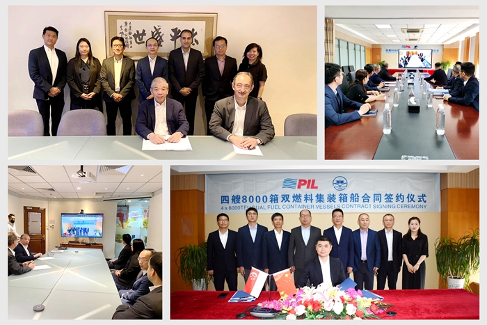 7月5日,我集團(tuán)與新加坡太平船務(wù)(PIL)簽訂了4艘8000TEU液化天然氣(LNG)動(dòng)力雙燃料集裝箱船訂單,雙方代表通過“云簽約”方式完成合同簽署。