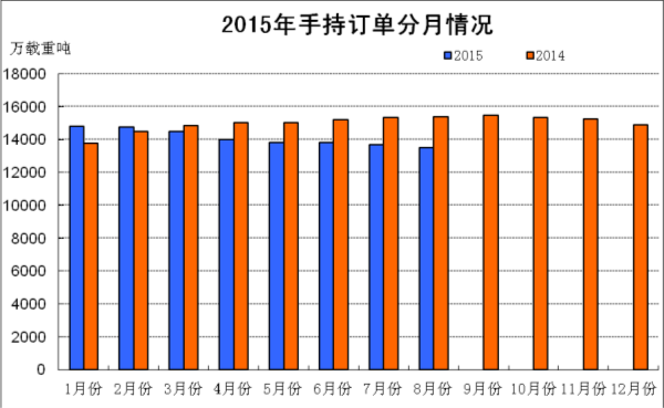 2015年1~8月,船舶工業(yè)經(jīng)濟運行總體保持平穩(wěn),造船完工量同比增長,受國際船舶市場低迷的影響,新承接船舶訂單、手持船舶訂單同比下降,新船價格低位震蕩,企業(yè)經(jīng)濟效益略有下降。
