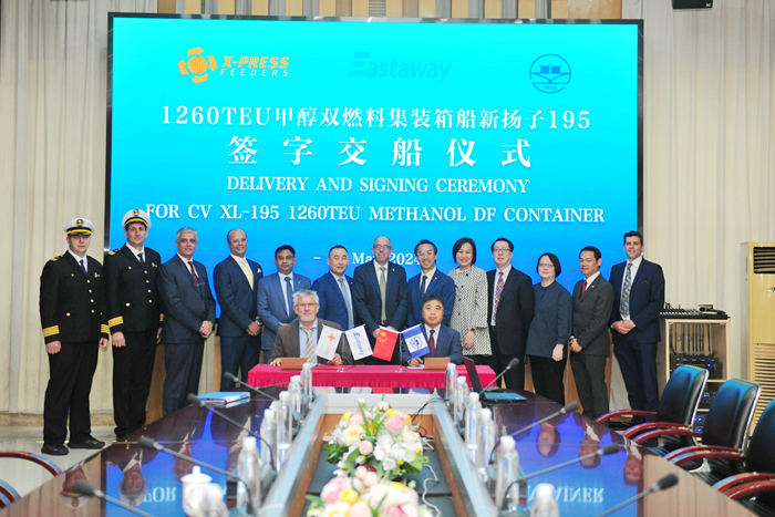 On the morning of May 16, the first 1260TEU methanol dual fuel container vessel built by our group's New Yangzi Shipbuilding for the Singapore shipowner X-Press Feeders signed for delivery. This type of vessel is an open feeder container vessel with a capacity of 1260TEU, which can load four different sizes of containers. This vessel measures 148m in length, 27.2m in moulded width, 14.3m in moulded depth, a scantling draft of 8.1m, a design speed of 14kn, and is equipped with two methanol fuel storage tanks and one methanol daily service tank.
